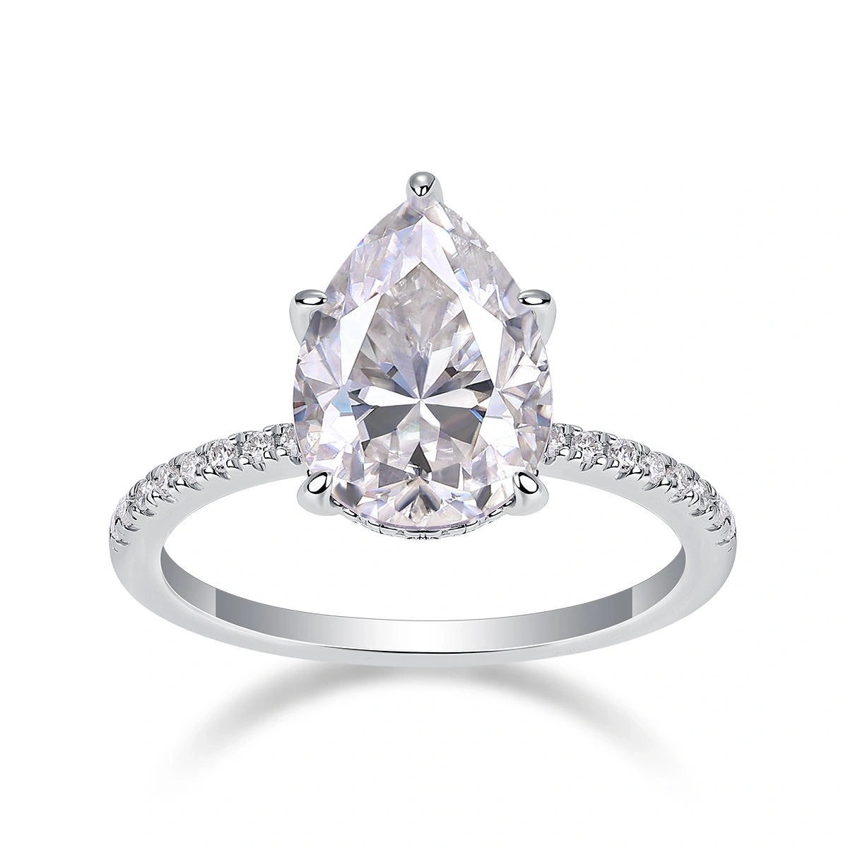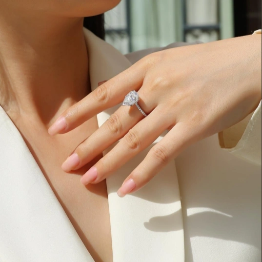 Dazzling and sophisticated, this 5CT Pear-Shaped Moissanite Ring is crafted from premium sterling silver to showcase its remarkable brilliance. The pear-cut moissanite is celebrated for its elegant teardrop shape, elongating the finger while reflecting exceptional fire and sparkle.