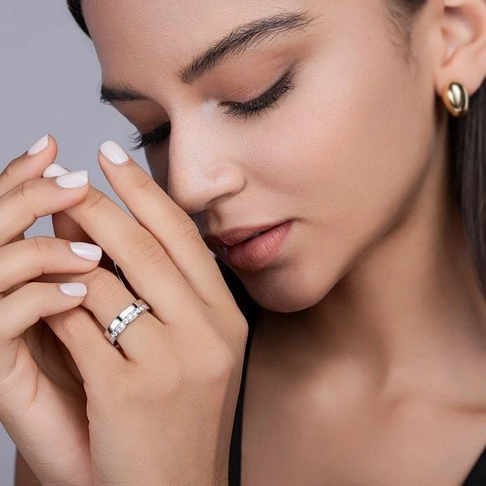 Designed for both beauty and durability, the pavé-set moissanites catch light from every angle, creating a dazzling, diamond-like shimmer that lasts a lifetime. Its sleek and versatile design allows it to be worn alone or stacked with other rings for a personalized, luxurious look.