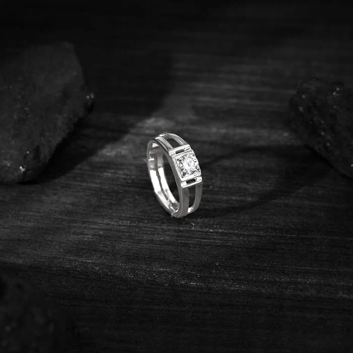 This ring captures the commanding presence of a man with vision - steady, confident, and unwavering in every stride of life. A single round-cut zircon shines in a sleek bezel-style square mount, while the split-shank band with open gaps adds a bold, modern edge to his signature style.